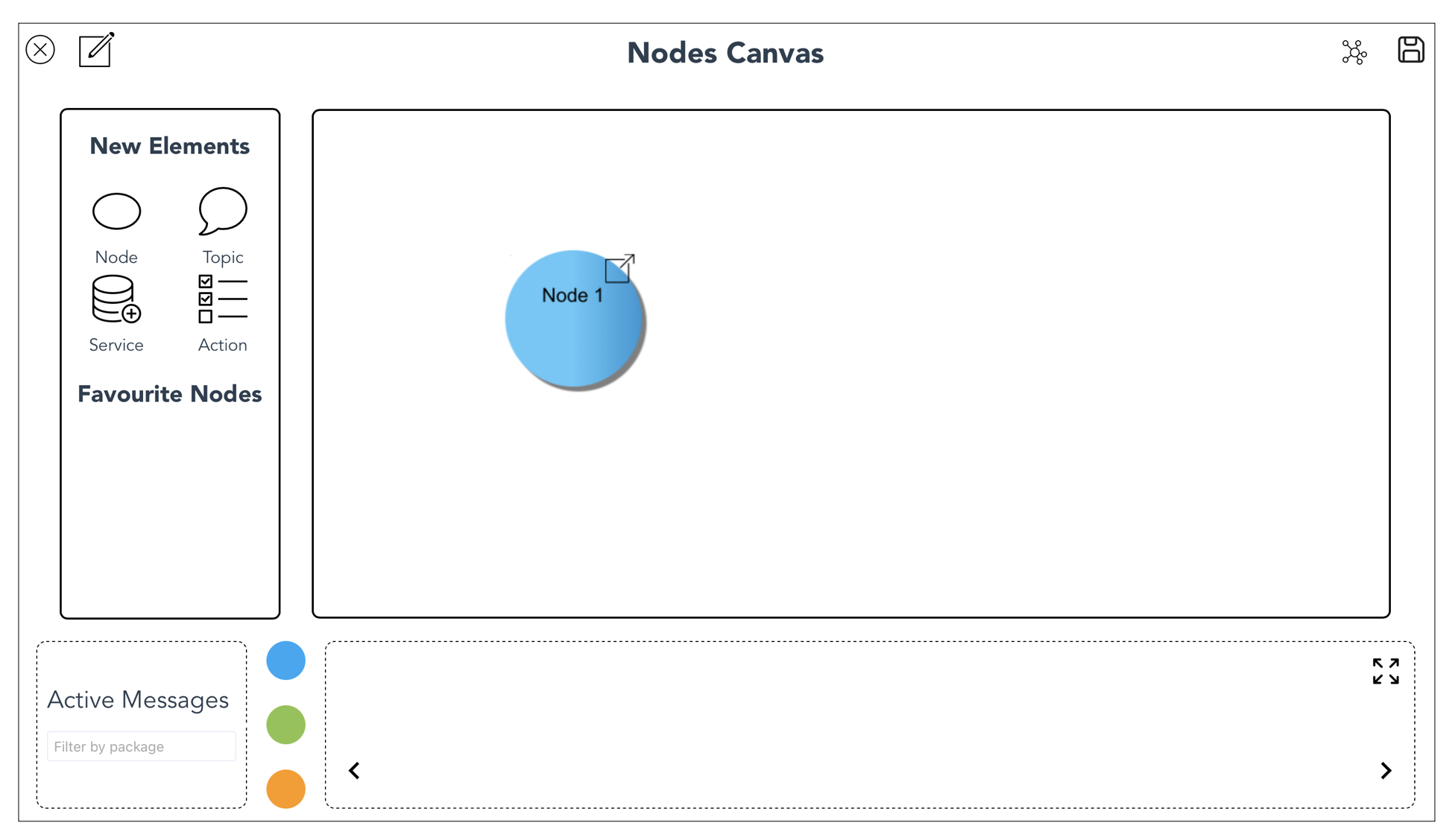 To start programming, drag one of the ROS elements from the left side pane to the main canvas. These ROS elements are: